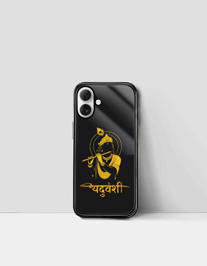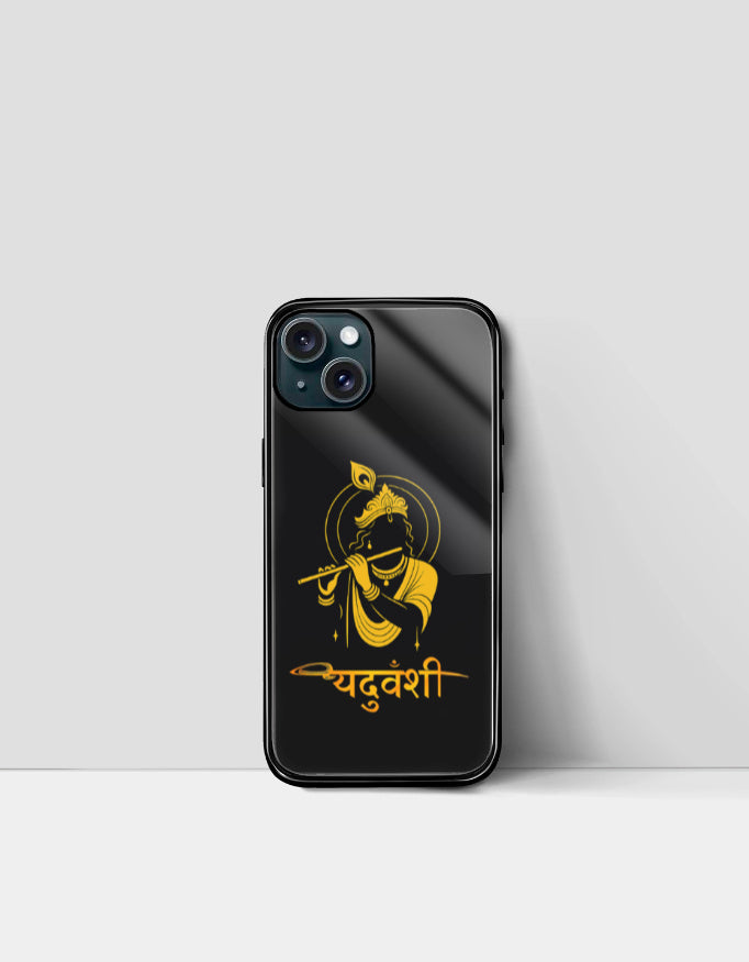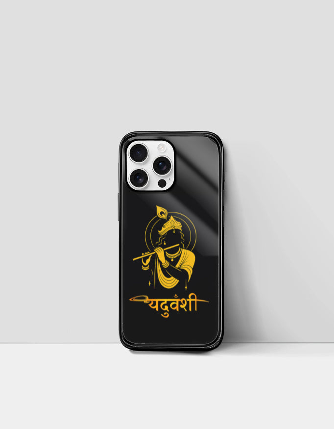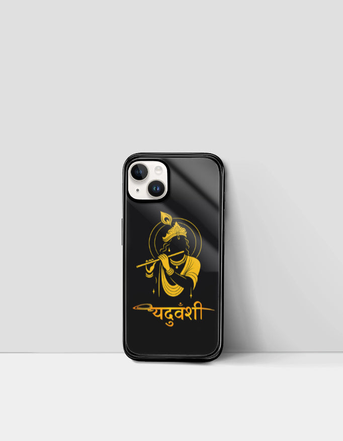 This black tempered glass back cover is beautifully printed with a Pitambari-clad Lord Krishna and the proud Yaduvanshi name in an elegant golden font, making it more than just a phone case—it’s a statement of identity.